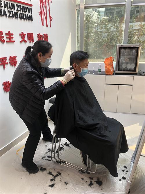 疫情爆發(fā)后,小區(qū)周邊商鋪都處于關(guān)閉狀態(tài),美發(fā)店鋪也不例外。熊世平注意到管理處員工長(zhǎng)時(shí)間無(wú)處理發(fā),有的男同事劉海都快遮住眼睛了,便決定“重操舊業(yè)”——免費(fèi)為大家理發(fā)。她在來(lái)深圳工作前,曾在老家當(dāng)過(guò)理發(fā)師,雖然有很多年沒(méi)再拿過(guò)理發(fā)剪,但還是決定嘗試。她的崗位是大堂助理,疫情期間非常忙碌,除日常工作外,還負(fù)責(zé)給進(jìn)出住戶測(cè)量體溫,門(mén)口臨時(shí)放置的快遞架也需不時(shí)去整理。每天下班后,即使已疲憊不堪,她也為大家免費(fèi)當(dāng)起理發(fā)師。有時(shí)累得連手臂都抬不起來(lái)了,她仍不肯歇一歇,只為剪出讓同事們滿意的發(fā)型。這一理就一發(fā)不可收拾,除了給自己管理處同事理發(fā),她還被公司其他管理處邀請(qǐng),總共給幾百號(hào)員工都理了發(fā)。大家都喜歡她的手藝,親昵地喊她“熊大”,都說(shuō)她是疫情中最美的理發(fā)師。